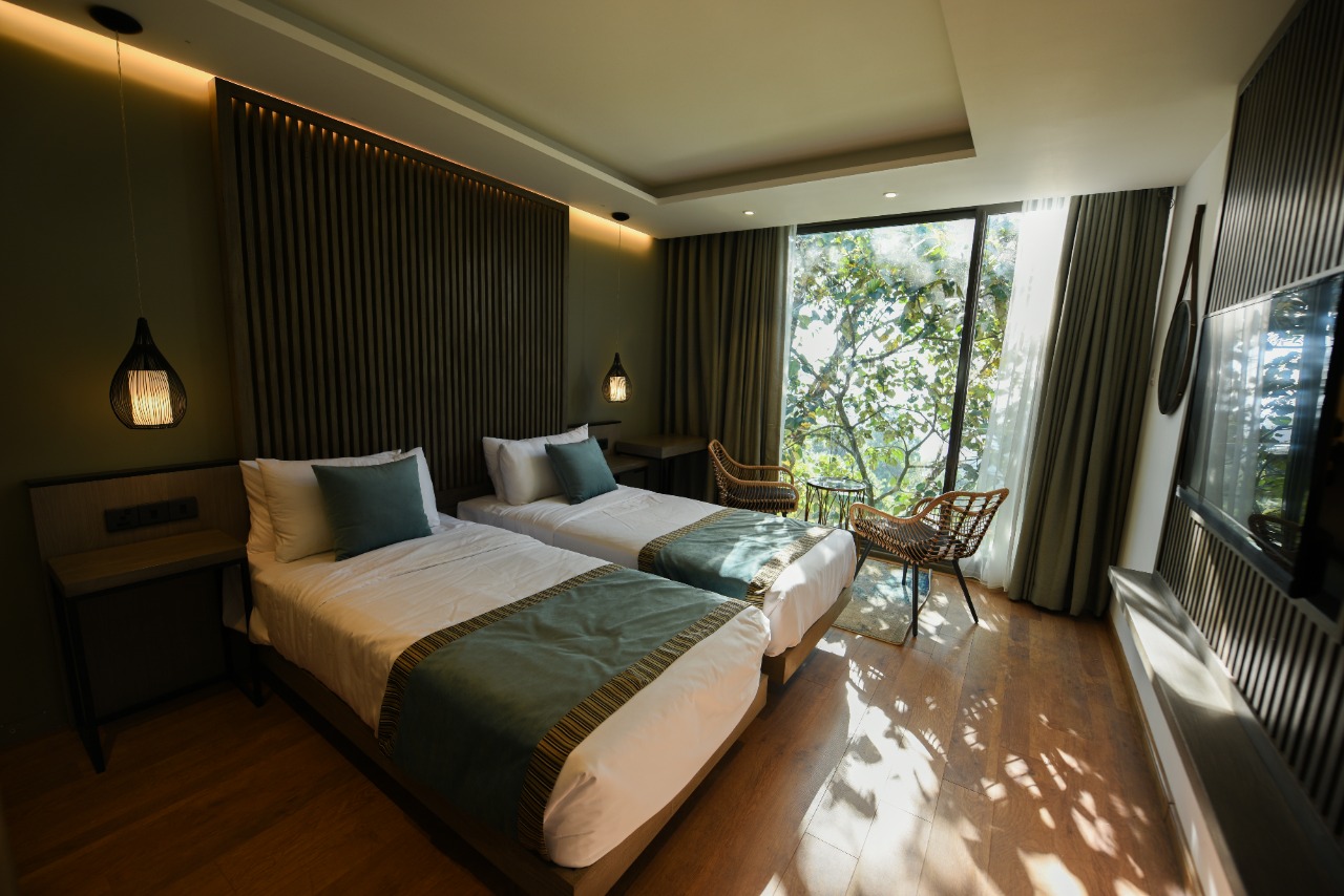 Our twin double room is an elegant, specious room with 2 extra long single beds. Some with view of Ella Gap and other into tree canopy full with wild birds in the morning.